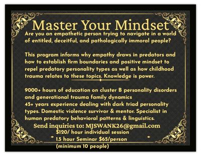 When you've survived a traumatic relationship, workplace, childhood or encounter with someone who uses manipulation, deception devaluation, isolation and covert passive aggression or violence to control you, it leaves a lasting impression on your nervous system and self image. Understanding techniques on how to regain a positive self image and mindset is imperative to being whole again and repelling predators in the future.